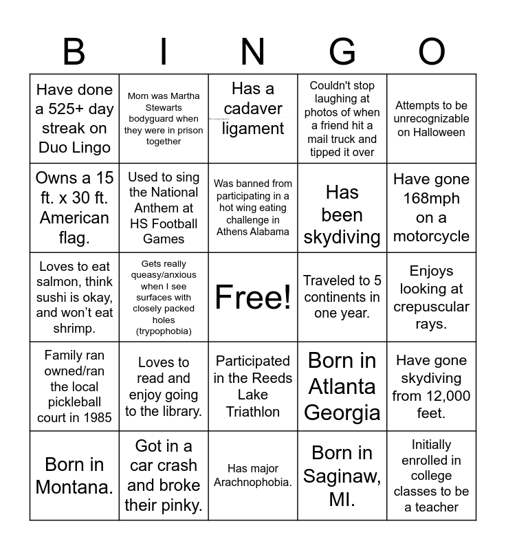 This bingo card has 1 images, a free space and 24 words: Loves to read and enjoy going to the library., Got in a car crash and broke their pinky., Was banned from participating in a hot wing eating challenge in Athens Alabama, Born in Montana., Attempts to be unrecognizable on Halloween, Have done a 525+ day streak on Duo Lingo, Owns a 15 ft. x 30 ft. American flag., Mom was Martha Stewarts bodyguard when they were in prison together, Traveled to 5 continents in one year., Participated in the Reeds Lake Triathlon, Has been skydiving, Loves to eat salmon, think sushi is okay, and won’t eat shrimp., Born in Atlanta Georgia, Have gone skydiving from 12,000 feet., Used to sing the National Anthem at HS Football Games, Born in Saginaw, MI., Enjoys looking at crepuscular rays., Has a cadaver ligament, Have gone 168mph on a motorcycle, Gets really queasy/anxious when I see surfaces with closely packed holes (trypophobia), Initially enrolled in college classes to be a teacher, Family ran owned/ran the local pickleball court in 1985, Couldn't stop laughing at photos of when a friend hit a mail truck and tipped it over and Has major Arachnophobia..