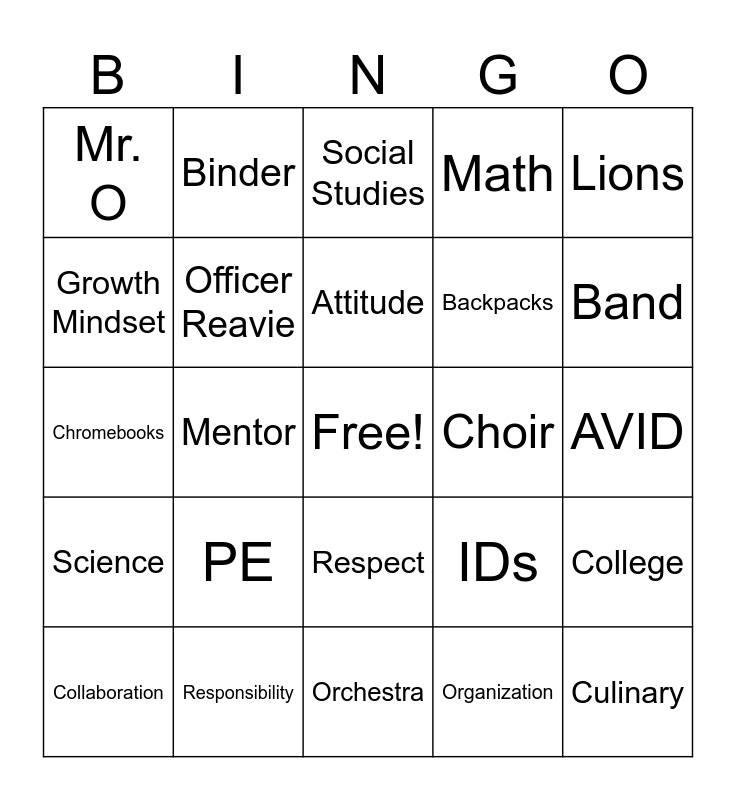 This bingo card has a free space and 26 words: Respect, Organization, Attitude, Responsibility, Lions, Mr. O, Growth Mindset, Binder, AVID, IDs, Backpacks, Chromebooks, College, Collaboration, Mentor, English, Math, Science, Social Studies, Culinary, Band, Orchestra, Choir, PE, Officer Reavie and Mrs. Lee.
