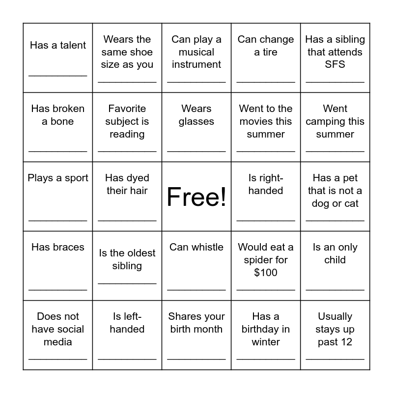 This bingo card has a free space and 24 words: Is the oldest sibling __________, Is left-handed __________, Wears glasses __________, Does not have social media __________, Has a sibling that attends SFS __________, Has a talent __________, Has broken a bone __________, Wears the same shoe size as you __________, Is right-handed __________, Can whistle __________, Went to the movies this summer __________, Plays a sport __________, Would eat a spider for $100 __________, Is an only child __________, Favorite subject is reading __________, Has a birthday in winter __________, Has a pet that is not a dog or cat __________, Can play a musical instrument __________, Went camping this summer __________, Has dyed their hair __________, Usually stays up past 12 __________, Has braces __________, Can change a tire __________ and Shares your birth month __________.