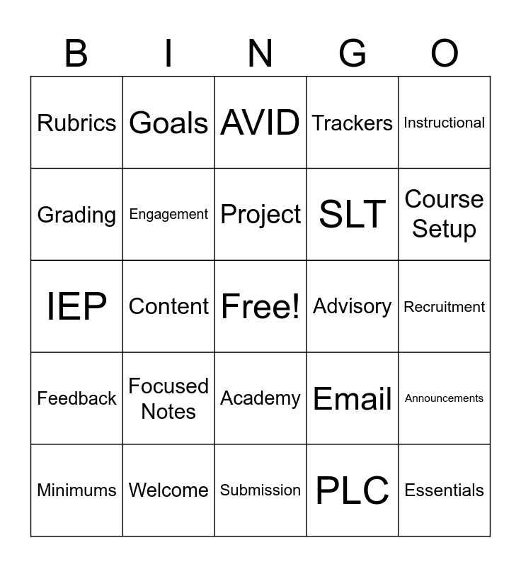 This bingo card has a free space and 37 words: Student, Contacts, Evaluation, Engagement, Announcements, Focused Notes, Project, Embedding, Instructional, Bucket, Content, Trackers, Essentials, Recruitment, Grading, Feedback, Log Entries, AVID, Academy, Advisory, Rubrics, Course Setup, Minimums, Submission, Pacing, PLC, Goals, Data, Announcement, Video, Intervention, Welcome, IEP, SPED, Email, SLT and Summer Camp.