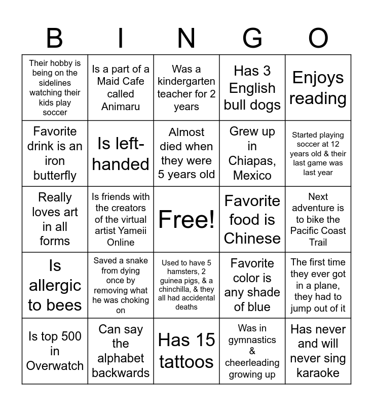This bingo card has a free space and 72 words: Lived in Germany for 4 years, Is a part of a Maid Cafe called Animaru, Is friends with the creators of the virtual artist Yameii Online, Used to play soccer, volleyball, basketball & softball, Favorite music genre is numetal, Broken 4 bones, Has 3 English bull dogs, Plays guitar, Grew up in Chiapas, Mexico, Likes to play pool, Is top 500 in Overwatch, Has been run over twice by a car, Started playing soccer at 12 years old & their last game was last year, Their hobby is being on the sidelines watching their kids play soccer, Has dyed their hair purple, pink, blue, red & orange, Really loves art in all forms, Favorite color is any shade of blue, Enjoys reading, Goal is to hike the 800-mile Arizona Trail, Next adventure is to bike the Pacific Coast Trail, Saved a snake from dying once by removing what he was choking on, Has never and will never sing karaoke, The first time they ever got in a plane, they had to jump out of it, If they were not an optometrist, they would probably be a financial advisor, Is an only child, Born in Iran and speak fluent Persian, Has double-jointed thumbs, Detained by police for criminal trespassing, First job was a dish washer, Performed a memorized 30-minute solo piano concert, Can say the alphabet backwards, Loves to cook, Biggest fear is snakes, Broke their arm while celebrating their 6th birthday, Was in gymnastics & cheerleading growing up, First concert they went to was the Hannah Montana & The Cheetah Girls Tour, Moved 7 times in 9 years, Wants to open their own coffee shop, Favorite drink is an iron butterfly, Got scammed & now their information is probably on the black market, Used to have 5 hamsters, 2 guinea pigs, & a chinchilla, & they all had accidental deaths, In the span of 4 years, they’ve had 10 different cars, Their hands and legs are double-jointed, Totaled their brother’s Mini Cooper by running over a curb right after turning 16, Fell down the stairs at their parent’s house and put a hole in the wall with their face, Is allergic to bees, Did theater in high school, Their middle name is Daniela, Can tie a neck bow tie, Favorite drink is Rémy Martin, Loves watching tennis, Broke their foot, Doesn’t know how to swim, Favorite food is Chinese, Has a pet turtle named Kai, Lived in 8 states & 2 countries, Was a kindergarten teacher for 2 years, Almost died when they were 5 years old, Hiked 553 miles since 02/2021 gaining 89,072 feet, Loves cleaning hiking trails & the Salt River. They have found a go pro-8, a pair of ray bans and a javelina tusk, Adopted from Russia, Was in the Air Force, Has totaled a motorcycle, Has 15 tattoos, Bought a house at 19 years old, Has 4 dogs, Is left-handed, Grew up on a farm, Is Navajo and speaks a little bit of Navajo, Lived in Akron, Ohio, Favorite animal is a butterfly and Childhood dream job was to become a fashion designer.