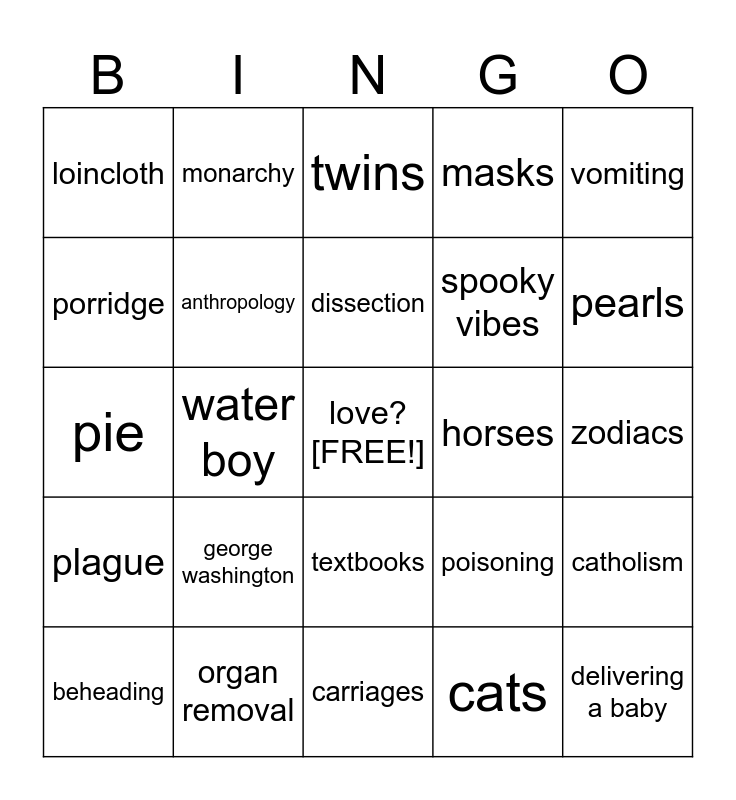 This bingo card has a free space and 24 words: george washington, organ removal, dissection, beheading, vomiting, loincloth, porridge, monarchy, horses, textbooks, spooky vibes, pie, poisoning, catholism, anthropology, cats, zodiacs, twins, pearls, water boy, delivering a baby, plague, masks and carriages.