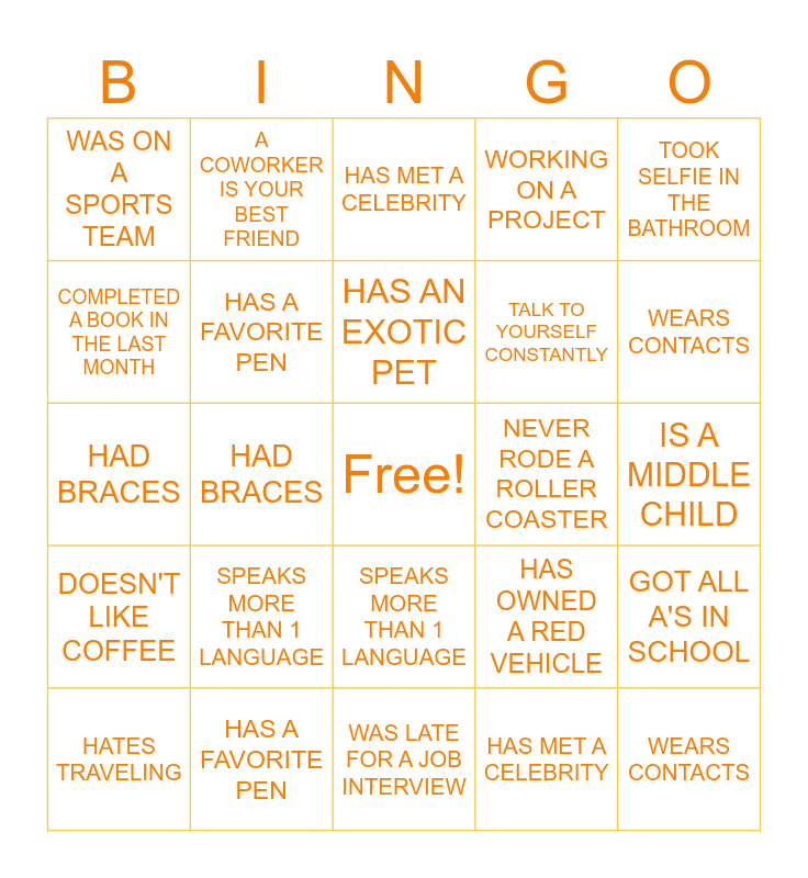 ⚠ This card has duplicate items: IS OCD (2), WEARS CONTACTS (2), HATES TRAVELING (2), WAS LATE FOR A JOB INTERVIEW (2), SPEAKS MORE THAN 1 LANGUAGE (2), DOESN'T LIKE COFFEE (2), A COWORKER IS YOUR BEST FRIEND (2), HAS BROKEN A BONE (2), COMPLETED A BOOK IN THE LAST MONTH (2), PRANKED A COWORKER (2), HAS A FAVORITE PEN (2), WORKING ON A PROJECT (2), GOT ALL A'S IN SCHOOL (2), HAS OWNED A RED VEHICLE (2), IS A MIDDLE CHILD (2), NEVER BEEN TO DISNEY (2), HAS AN EXOTIC PET (2), NEVER RODE A ROLLER COASTER (2), CAN PLAY AN INSTRUMENT (2), TOOK SELFIE IN THE BATHROOM (2), HAD BRACES (2), HAS MET A CELEBRITY (2), WAS ON A SPORTS TEAM (2), TALK TO YOURSELF CONSTANTLY (2)