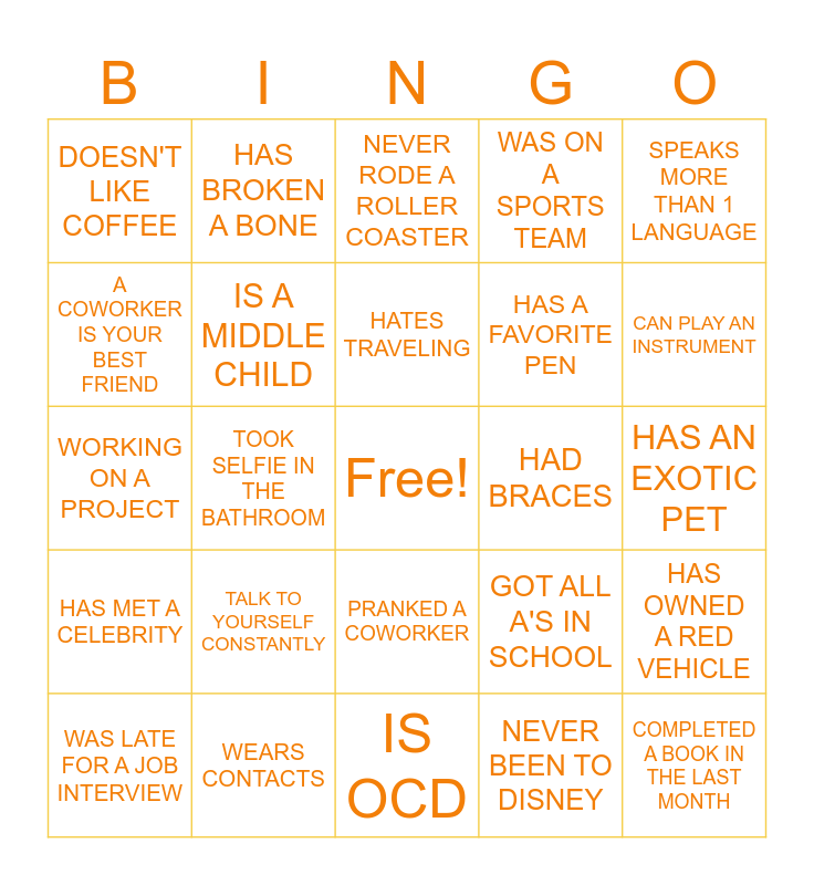 This bingo card has a free space and 24 words: TALK TO YOURSELF CONSTANTLY, WEARS CONTACTS, HATES TRAVELING, WAS LATE FOR A JOB INTERVIEW, SPEAKS MORE THAN 1 LANGUAGE, DOESN'T LIKE COFFEE, A COWORKER IS YOUR BEST FRIEND, HAS BROKEN A BONE, HAD BRACES, PRANKED A COWORKER, HAS A FAVORITE PEN, WORKING ON A PROJECT, GOT ALL A'S IN SCHOOL, HAS OWNED A RED VEHICLE, IS A MIDDLE CHILD, NEVER BEEN TO DISNEY, HAS AN EXOTIC PET, NEVER RODE A ROLLER COASTER, CAN PLAY AN INSTRUMENT, TOOK SELFIE IN THE BATHROOM, COMPLETED A BOOK IN THE LAST MONTH, HAS MET A CELEBRITY, WAS ON A SPORTS TEAM and IS OCD.