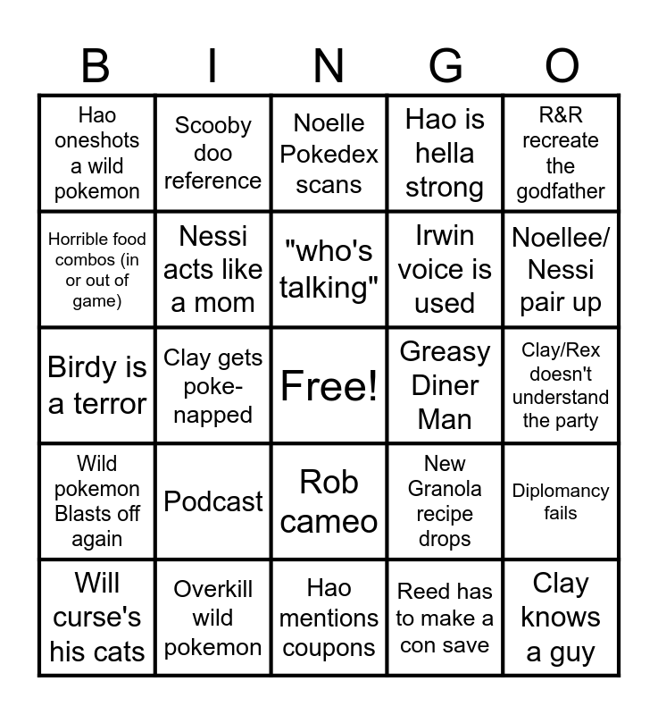 This bingo card has a free space and 29 words: Will curse's his cats, Team Regen Attacks, Clay gets poke-napped, Reed Mentions his scars, Hao oneshots a wild pokemon, Noelle Pokedex scans, Nessi acts like a mom, Podcast, Greasy Diner Man, Overkill wild pokemon, Clay/Rex doesn't understand the party, Clay knows a guy, Hao mentions coupons, Reed has to make a con save, Noellee/ Nessi pair up, *and roll w/ disadvantage, Rob cameo, Wild pokemon Blasts off again, R&R recreate the godfather, Birdy is a terror, New Granola recipe drops, Cleared a route, Irwin voice is used, Horrible food combos (in or out of game), Hao is hella strong, Scooby doo reference, Diplomancy fails, "who's talking" and Fishing mini game.