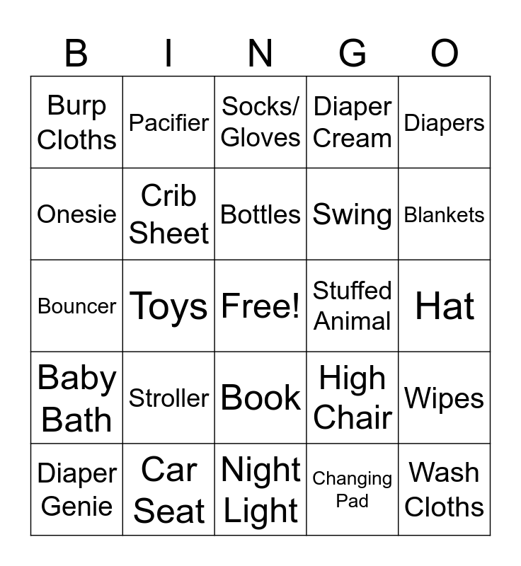 This bingo card has a free space and 24 words: Stroller, Car Seat, Bottles, Diaper Genie, Diapers, Burp Cloths, Onesie, Pacifier, Stuffed Animal, Book, Swing, Bouncer, High Chair, Wipes, Crib Sheet, Changing Pad, Hat, Socks/ Gloves, Blankets, Toys, Wash Cloths, Baby Bath, Diaper Cream and Night Light.