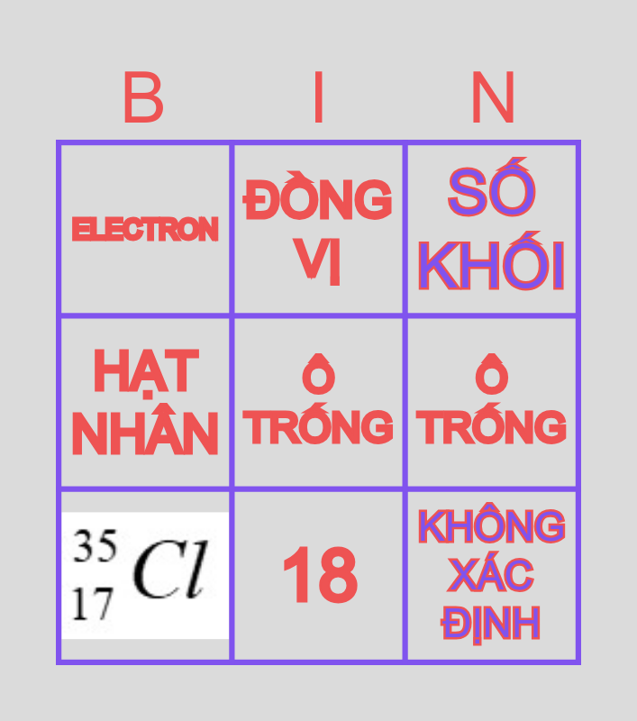 This bingo card has 1 images, a free space and 7 words: HẠT NHÂN, ĐỒNG VỊ, Ô TRỐNG, SỐ KHỐI, ELECTRON, 18 and KHÔNG XÁC ĐỊNH.