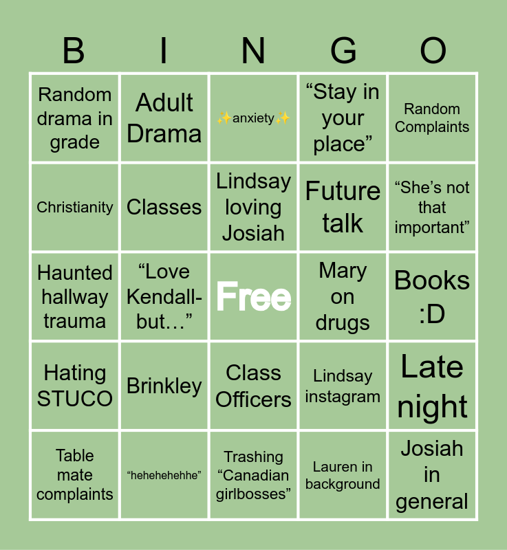 This bingo card has a free space and 24 words: Brinkley, “hehehehehhe”, Lindsay loving Josiah, Table mate complaints, Random Complaints, Random drama in grade, Christianity, Adult Drama, Mary on drugs, Class Officers, Future talk, Haunted hallway trauma, Lindsay instagram, Late night, Classes, Lauren in background, Books :D, ✨anxiety✨, “She’s not that important”, “Love Kendall- but…”, Josiah in general, Hating STUCO, “Stay in your place” and Trashing “Canadian girlbosses”.