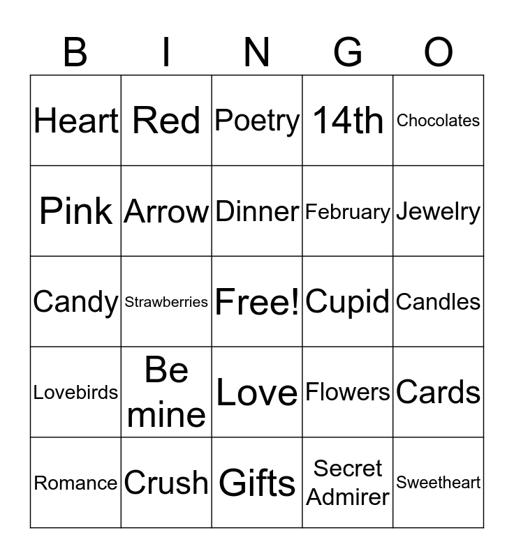 This bingo card has a free space and 25 words: Be mine, Gifts, Dinner, Romance, Chocolates, Heart, Pink, Red, Cupid, Love, February, Candy, Flowers, Cards, Arrow, Rose, Candles, Poetry, Jewelry, Strawberries, Sweetheart, Crush, Lovebirds, 14th and Secret Admirer.