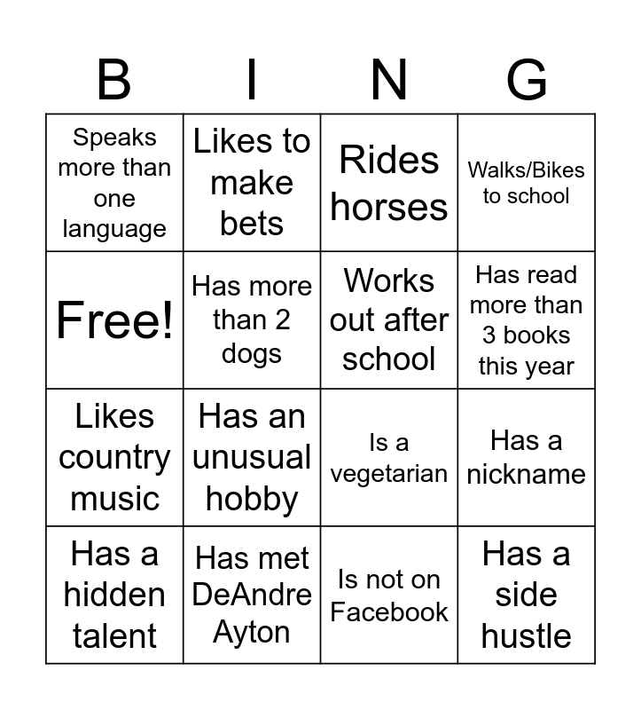 This bingo card has 16 words: Has met DeAndre Ayton, Has a nickname, Rides horses, Speaks more than one language, Likes country music, Likes to make bets, Is a vegetarian, Is not on Facebook, Free!, Has more than 2 dogs, Has a hidden talent, Walks/Bikes to school, Has an unusual hobby, Has read more than 3 books this year, Works out after school and Has a side hustle.