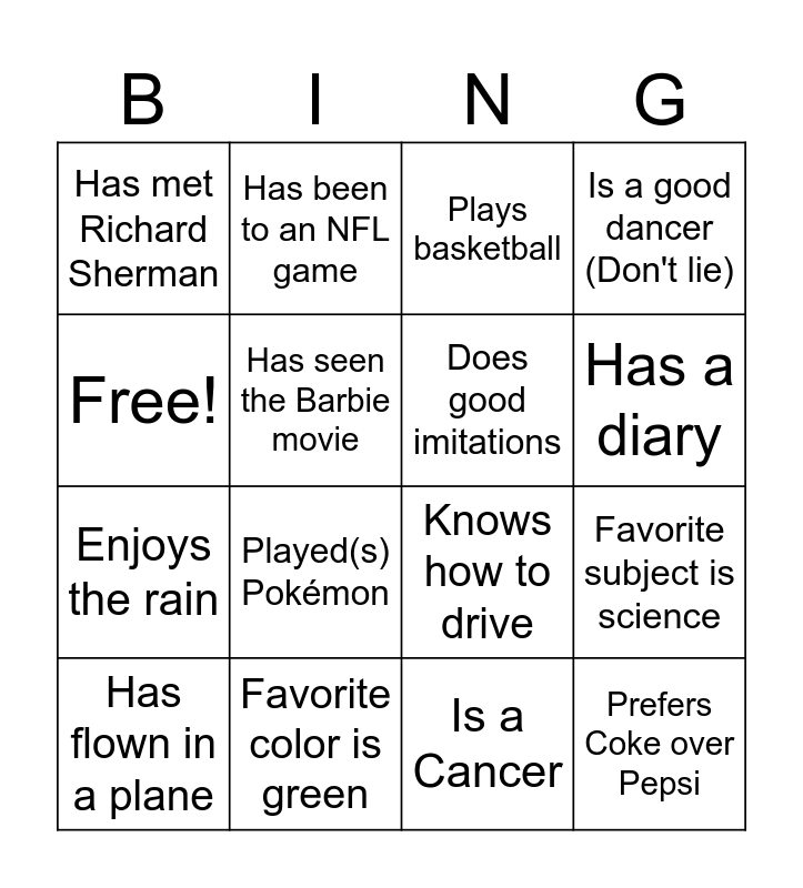 This bingo card has 16 words: Favorite color is green, Favorite subject is science, Plays basketball, Has met Richard Sherman, Enjoys the rain, Has been to an NFL game, Knows how to drive, Is a Cancer, Free!, Has seen the Barbie movie, Has flown in a plane, Is a good dancer (Don't lie), Played(s) Pokémon, Has a diary, Does good imitations and Prefers Coke over Pepsi.
