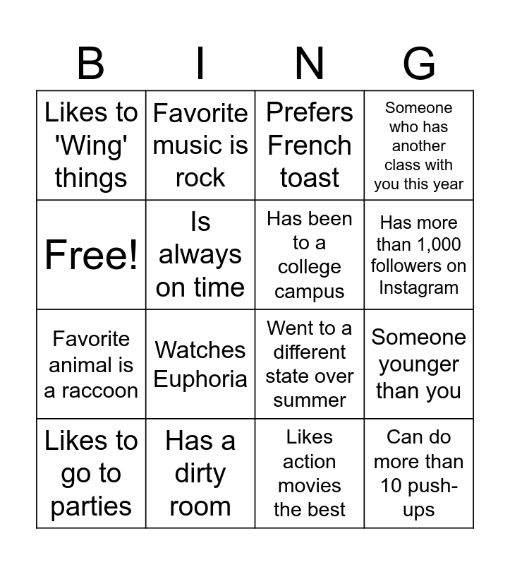 This bingo card has 16 words: Has a dirty room, Someone younger than you, Prefers French toast, Likes to 'Wing' things, Favorite animal is a raccoon, Favorite music is rock, Went to a different state over summer, Likes action movies the best, Free!, Is always on time, Likes to go to parties, Someone who has another class with you this year, Watches Euphoria, Has more than 1,000 followers on Instagram, Has been to a college campus and Can do more than 10 push-ups.