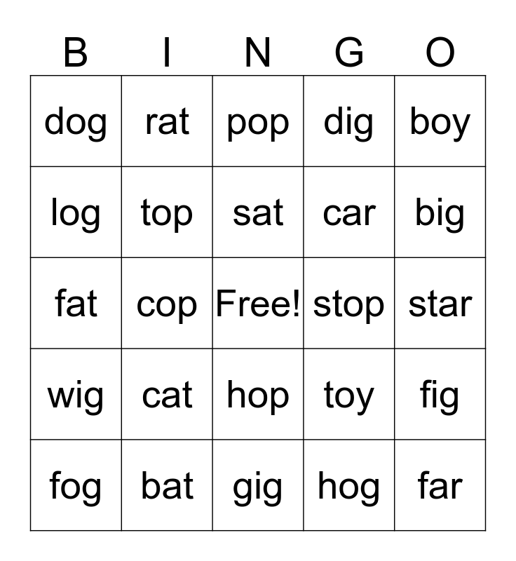 This bingo card has a free space and 24 words: cat, bat, sat, fog, boy, dog, log, rat, stop, hop, car, fat, toy, fig, top, hog, star, pop, big, cop, far, wig, dig and gig.