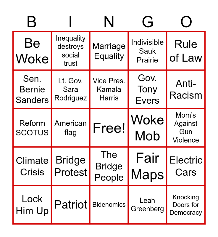 This bingo card has a free space and 45 words: Marriage Equality, Knocking Doors for Democracy, Betty Koehl, Lock Him Up, Ezra Levin, Leah Greenberg, Marriage Equality, Trans Rights, Rule of Law, Patriot, Indivisible Sauk Prairie, Woke Mob, The Bridge People, Bridge Protest, Knocking Doors for Democracy, Bidenomics, I’m Ridin’ with Biden, Reform SCOTUS, Our bodies, our choice, Anti-Racism, Inequality destroys social trust, Vote for Democracy, Be Kind, Be Woke, 2nd Amendment: Well Regulated, Mom’s Against Gun Violence, Barack Obama, Franklin Roosevelt, Fair Maps, Climate Crisis, Climate Justice, Electric Cars, Greenhouse Gas, Rich pay their fair share, Freedom, American flag, Old Glory, INDICTMENTS!!, President Joe Biden, Vice Pres. Kamala Harris, Sen. Bernie Sanders, Gov. Tony Evers, Justice Janet, Lt. Gov. Sara Rodriguez and Planned Parenthood.