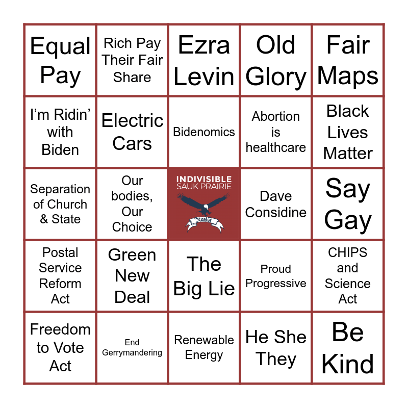 This bingo card has a free space and 75 words: Betty Koehl, Lock Him Up, Ezra Levin, Leah Greenberg, Marriage Equality, Trans Rights, Rule of Law, Patriot, Woke Mob, The Bridge People, Bridge Protest, Knocking Doors, Bidenomics, I’m Ridin’ with Biden, Reform SCOTUS, Our bodies, Our Choice, Anti-Racism, Be Kind, Be Woke, Fair Maps, Climate Crisis, Separation of Church & State, Electric Cars, Rich Pay Their Fair Share, Old Glory, INDICTMENTS!!, Kamala Harris, Bernie Sanders, Tony Evers, Justice Janet, Planned Parenthood, Free Speech, We the People, Proud Progressive, Black Lives Matter, Abortion is healthcare, Pride, Love is Love, Say Gay, He She They, No Human is Illegal, DACA, Protest is Patriotic, Say Their Names, Inflation Reduction Act, American Rescue Plan Act, Freedom to Vote Act, Equal Pay, Unions, Equal Rights Amendment, End the Filibuster, The Big Lie, Clean Air, Democracy, Commonsense Gun Laws, Free Press, Healthcare for All, Fair Tax Code, Read banned books, Pro-Choice, Green New Deal, Tree-hugger, Save Social Security, Fair Elections, Mark Pocan, Dave Considine, Tammy Baldwin, Mental Health Funding, Cancel Student Loans, CHIPS and Science Act, Postal Service Reform Act, End Gerrymandering, Support Public Education, Renewable Energy and Jack Smith.