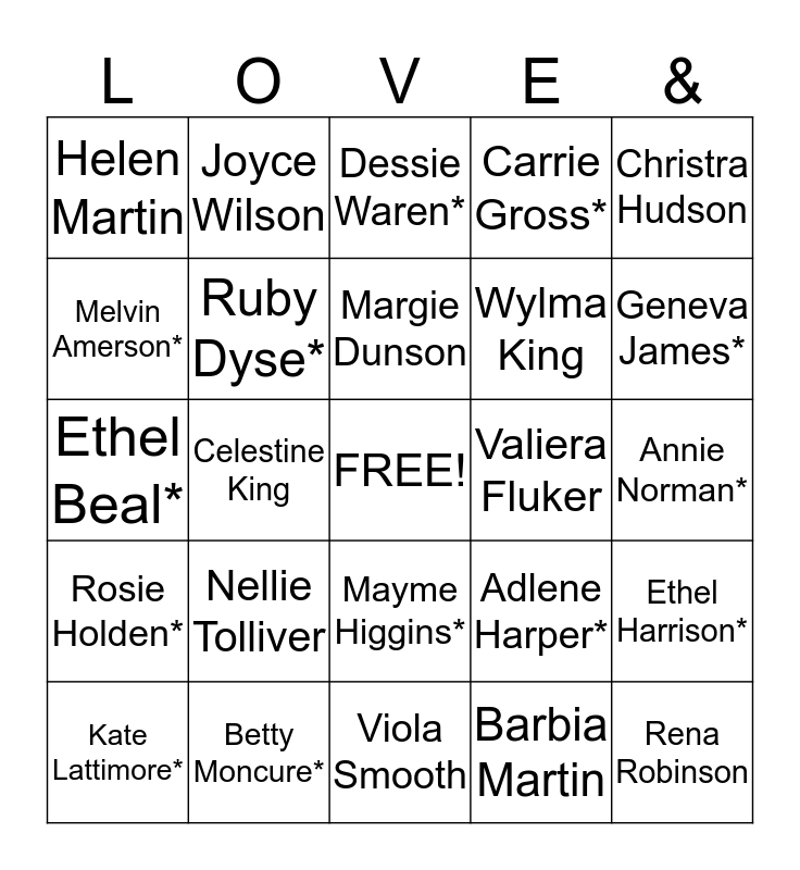 This bingo card has a free space and 49 words: Robbie Owens, Rena Robinson, Amelita Ross, Viola Smooth, Nellie Tolliver, Shirley Wilder, Joyce Wilson, Mary Simpson**, Melvin Amerson*, Jimmye Bailey*, Ruby Dyse*, Carrie Gross*, Ethel Harrison*, Adlene Harper*, Lorraine Barner, Annie Denham, Margie Dunson, Valiera Fluker, Maxine Herron, Christra Hudson, Celestine King, Barbia Martin, Helen Martin, Wylma King, Florence Henderson*, Geneva James*, Kate Lattimore*, Cleo McLemore*, Mayme Higgins*, Rosie Holden*, Willene Holmes*, Lillie B. Jones*, Mary R. Jones*, Rosie Mitchell*, Betty Moncure*, Annie Mosley*, Claudia Myers*, Beatrice Newsome*, Annie Norman*, Pearl Odom*, Myrtle Paynes*, Inez Smith*, Shirley Thompson*, Maggie Turner*, Ethel Beal*, Dessie Waren*, Geneva B. White*, Geneva E. White* and Jean Wingard*.
