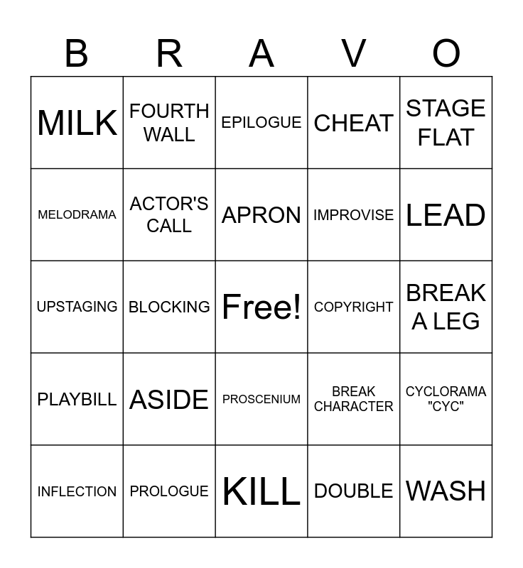 This bingo card has a free space and 39 words: ARTICULATION, PROJECTION, DOWNSTAGE, ACTOR'S CALL, INFLECTION, PROSCENIUM, APRON, STRIKE, STAGE FLAT, PLAYBILL, BLOCKING, CHEAT, WASH, BREAK A LEG, COPYRIGHT, ASIDE, PANTOMIME, MILK, RISER, BREAK CHARACTER, MELODRAMA, KILL, IMPROVISE, LEAD, ENUNCIATION, HOUSE, CURTAIN CALL, FLY, HAM, FOURTH WALL, SPOT, FARCE, EPILOGUE, PROLOGUE, DOUBLE, OPEN, CYCLORAMA "CYC", UPSTAGING and SOLILOQUY.