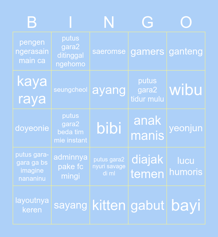 This bingo card has 25 words: putus gara-gara ga bs imagine nananinu, sayang, bibi, gabut, ganteng, pengen ngerasain main ca, putus gara2 ditinggal ngehomo, saeromse, anak manis, lucu humoris, kaya raya, seungcheol, kitten, diajak temen, wibu, layoutnya keren, putus gara2 beda tim mie instant, ayang, putus gara2 tidur mulu, yeonjun, doyeonie, adminnya pake fc mingi, putus gara2 nyuri savage di ml, gamers and bayi.