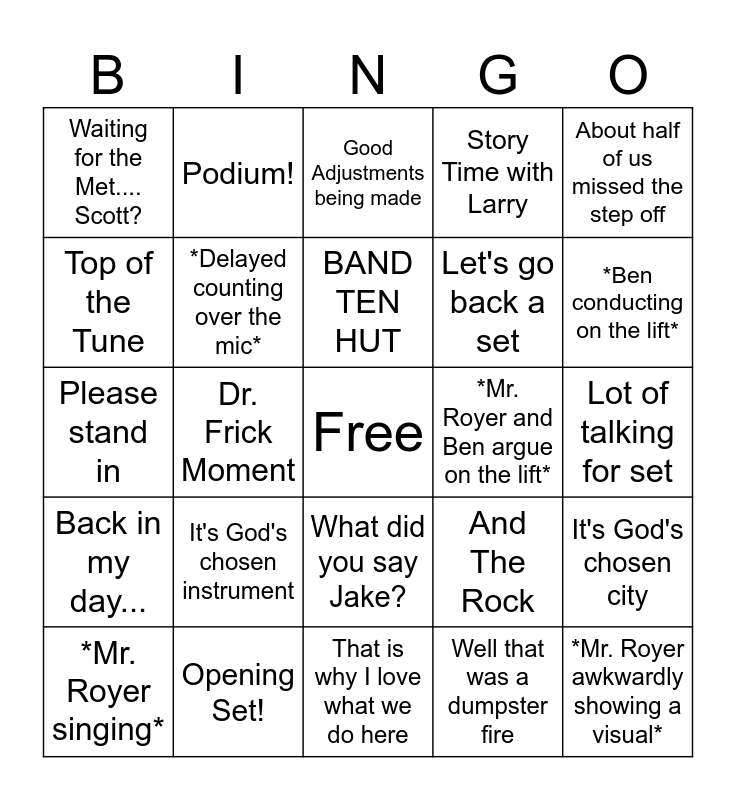 This bingo card has a free space and 24 words: It's God's chosen instrument, Opening Set!, BAND TEN HUT, *Mr. Royer singing*, About half of us missed the step off, Waiting for the Met.... Scott?, Top of the Tune, Podium!, *Mr. Royer and Ben argue on the lift*, What did you say Jake?, Let's go back a set, Please stand in, And The Rock, It's God's chosen city, *Delayed counting over the mic*, Well that was a dumpster fire, Lot of talking for set, Good Adjustments being made, *Ben conducting on the lift*, Dr. Frick Moment, *Mr. Royer awkwardly showing a visual*, Back in my day..., Story Time with Larry and That is why I love what we do here.