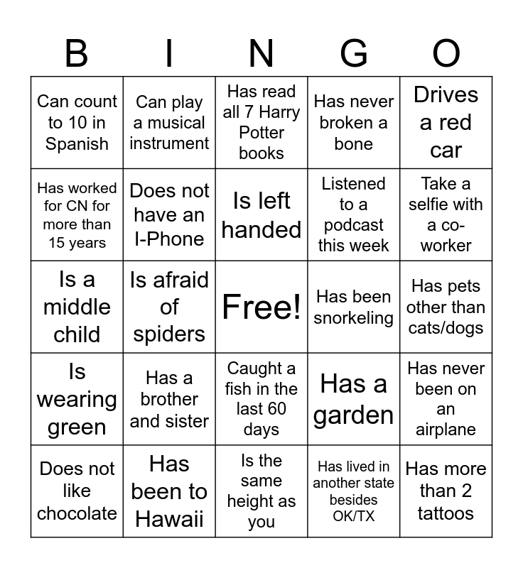 This bingo card has a free space and 24 words: Has a brother and sister, Has been to Hawaii, Is left handed, Does not like chocolate, Drives a red car, Can count to 10 in Spanish, Has worked for CN for more than 15 years, Can play a musical instrument, Has been snorkeling, Caught a fish in the last 60 days, Listened to a podcast this week, Is a middle child, Has a garden, Has never been on an airplane, Does not have an I-Phone, Has lived in another state besides OK/TX, Has pets other than cats/dogs, Has read all 7 Harry Potter books, Take a selfie with a co-worker, Is afraid of spiders, Has more than 2 tattoos, Is wearing green, Has never broken a bone and Is the same height as you.