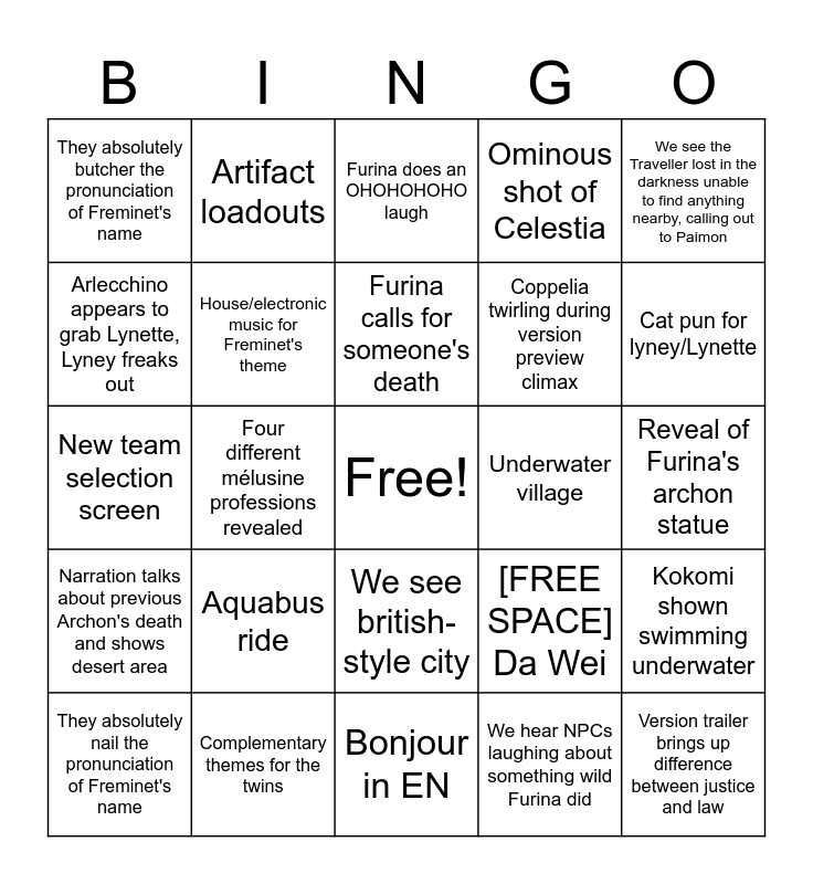 This bingo card has a free space and 25 words: Aquabus ride, Bonjour in EN, Furina calls for someone's death, They absolutely nail the pronunciation of Freminet's name, We see the Traveller lost in the darkness unable to find anything nearby, calling out to Paimon, They absolutely butcher the pronunciation of Freminet's name, Arlecchino appears to grab Lynette, Lyney freaks out, Artifact loadouts, Underwater village, We see british-style city, Coppelia twirling during version preview climax, New team selection screen, [FREE SPACE] Da Wei, Kokomi shown swimming underwater, House/electronic music for Freminet's theme, french music 5-minute concert, Reveal of Furina's archon statue, Furina does an OHOHOHOHO laugh, Cat pun for lyney/Lynette, Four different mélusine professions revealed, Version trailer brings up difference between justice and law, Complementary themes for the twins, Narration talks about previous Archon's death and shows desert area, Ominous shot of Celestia and We hear NPCs laughing about something wild Furina did.