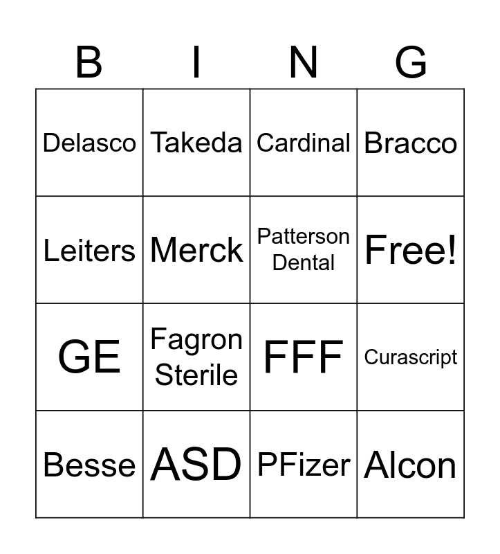 This bingo card has 17 words: PFizer, Besse, Cardinal, Delasco, Fagron Sterile, Bracco, Curascript, Patterson Dental, Free!, Merck, ASD, FFF, Leiters, Takeda, GE, Cooper Surgical and Alcon.
