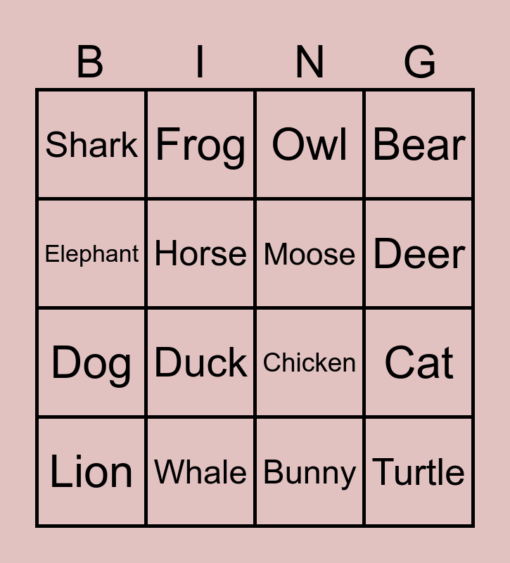 This bingo card has 20 words: Cat, Tiger, Owl, Ostrich, Lion, Elephant, Whale, Shark, Dog, Frog, Duck, Chicken, Horse, Turtle, Moose, Beaver, Deer, Bear, Bunny and Pig.
