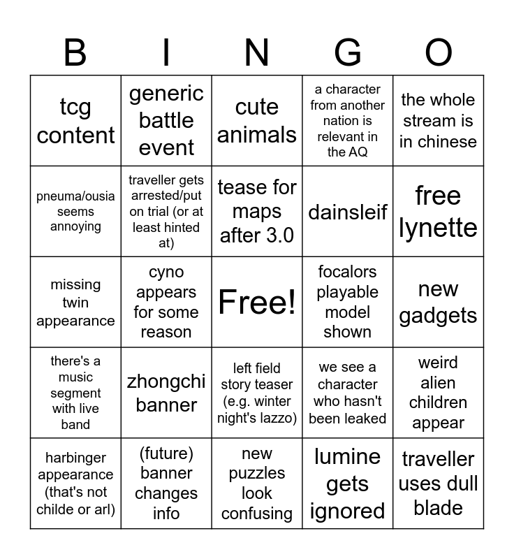 This bingo card has a free space and 24 words: zhongchi banner, (future) banner changes info, tease for maps after 3.0, harbinger appearance (that's not childe or arl), the whole stream is in chinese, tcg content, pneuma/ousia seems annoying, generic battle event, focalors playable model shown, left field story teaser (e.g. winter night's lazzo), dainsleif, missing twin appearance, we see a character who hasn't been leaked, weird alien children appear, traveller gets arrested/put on trial (or at least hinted at), lumine gets ignored, new gadgets, cute animals, free lynette, cyno appears for some reason, traveller uses dull blade, there's a music segment with live band, a character from another nation is relevant in the AQ and new puzzles look confusing.