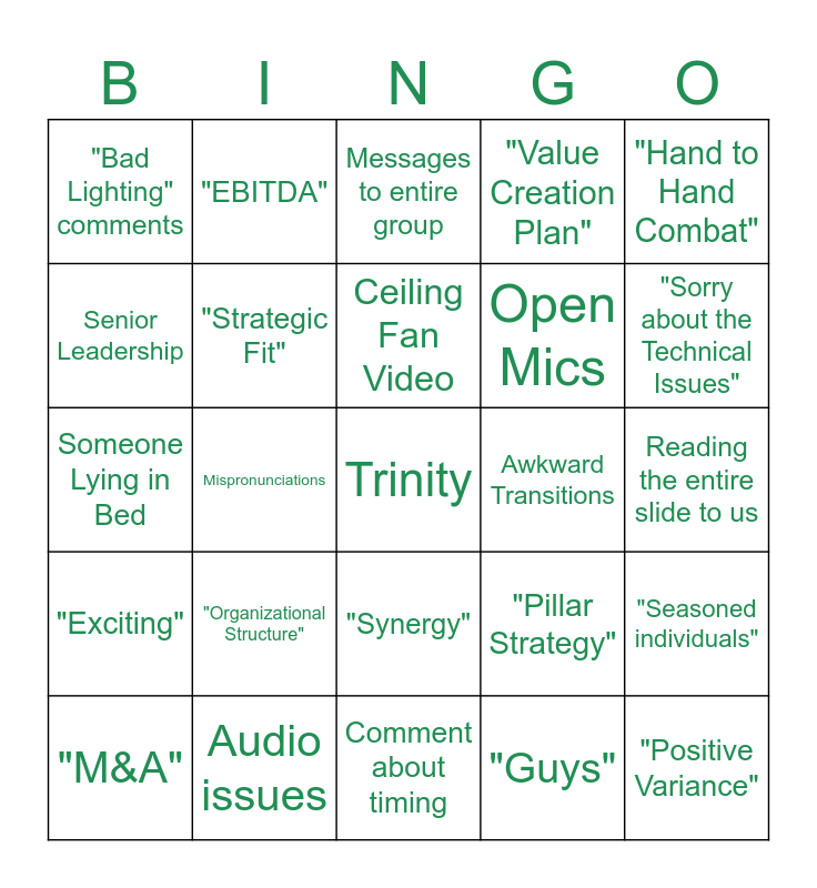 This bingo card has a free space and 33 words: Naked person, "Acquisition Pipeline", Mispronunciations, "Organic Growth", "Exciting", "Strategic Fit", "Hand to Hand Combat", "M&A", "EBITDA", 600 people on a call, Ceiling Fan Video, Messages to entire group, "Growth Objectives", Comments about inaudible background noise, Awkward Transitions, "Sorry about the Technical Issues", Audio issues, Someone Lying in Bed, "Organizational Structure", "Pillar Strategy", "Synergy", "Strategy", "Bad Lighting" comments, Reading the entire slide to us, Comment about timing, "Positive Variance", "Value Creation Plan", Open Mics, Senior Leadership, "Seasoned individuals", "Semi Annual", "Guys" and Post Call "thank you" messages.