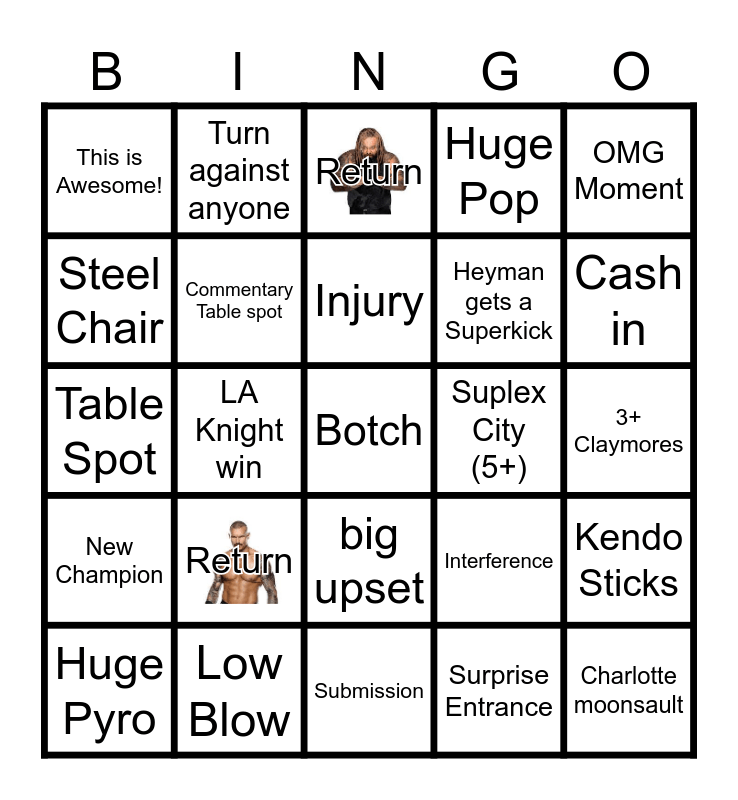 This bingo card has 2 images, a free space and 24 words: Return, Low Blow, Injury, Huge Pyro, OMG Moment, This is Awesome!, Steel Chair, Turn against anyone, Suplex City (5+), big upset, Heyman gets a Superkick, Table Spot, Interference, Kendo Sticks, Commentary Table spot, Surprise Entrance, 3+ Claymores, Return, Cash in, LA Knight win, Charlotte moonsault, New Champion, Huge Pop and Submission.