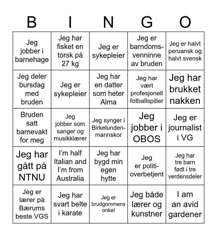 This bingo card has 25 words: I’m half Italian and I’m from Australia, Jeg er brudgommens onkel, Jeg har en datter som heter Alma, Jeg er lærer på Bærums beste VGS, Jeg er halvt peruansk og halvt svensk, Jeg jobber i barnehage, Jeg deler bursdag med bruden, Jeg har fisket en torsk på 27 kg, Jeg jobber i OBOS, Jeg har bygd min egen hytte, Jeg har vært profesjonell fotballspiller, Bruden satt barnevakt for meg, Jeg er politi-overbetjent, Jeg har tre barn født i tre verdensdeler, Jeg er sykepleier, I am an avid gardener, Jeg er journalist i VG, Jeg er sykepleier, Jeg har brukket nakken, Jeg jobber som sanger og musikklærer, Jeg synger i Birkelunden-mannskor, Jeg har svart belte i karate, Jeg har gått på NTNU, Jeg er barndoms-venninne av bruden and Jeg både lærer og kunstner.