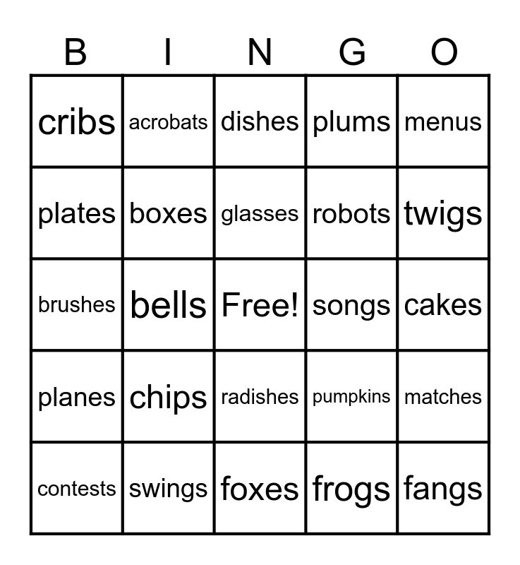 This bingo card has a free space and 24 words: chips, swings, glasses, contests, menus, cribs, plates, acrobats, songs, radishes, robots, brushes, pumpkins, matches, boxes, frogs, cakes, dishes, twigs, bells, fangs, planes, plums and foxes.