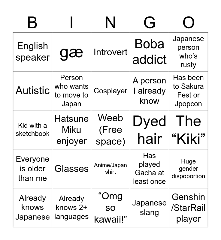 This bingo card has a free space and 24 words: Glasses, Already knows 2+ languages, Cosplayer, Already knows Japanese, Japanese person who’s rusty, English speaker, Autistic, gæ, Dyed hair, Anime/Japan shirt, A person I already know, Kid with a sketchbook, Has played Gacha at least once, Huge gender dispoportion, Person who wants to move to Japan, Japanese slang, The “Kiki”, Introvert, Has been to Sakura Fest or Jpopcon, Hatsune Miku enjoyer, Genshin /StarRail player, Everyone is older than me, Boba addict and “Omg so kawaii!”.