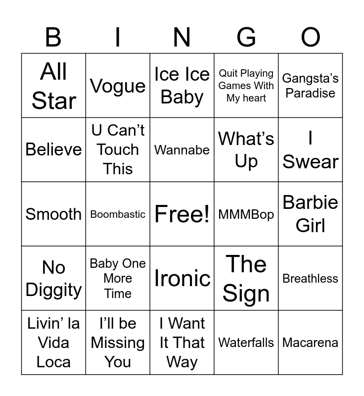 This bingo card has a free space and 25 words: Baby One More Time, I Want It That Way, Wannabe, Livin’ la Vida Loca, Gangsta’s Paradise, All Star, Believe, Vogue, MMMBop, Ironic, What’s Up, Smooth, The Sign, Breathless, U Can’t Touch This, Mambo No. 5, Barbie Girl, Ice Ice Baby, I Swear, Boombastic, Macarena, I’ll be Missing You, No Diggity, Quit Playing Games With My heart and Waterfalls.