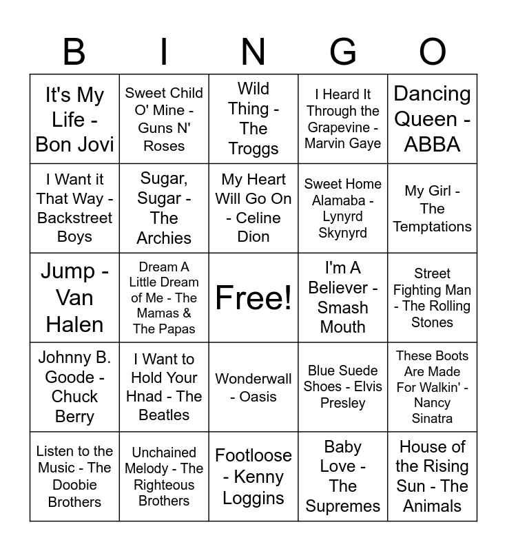 This bingo card has a free space and 25 words: I Want to Hold Your Hnad - The Beatles, Footloose - Kenny Loggins, My Heart Will Go On - Celine Dion, Listen to the Music - The Doobie Brothers, Dancing Queen - ABBA, It's My Life - Bon Jovi, I Want it That Way - Backstreet Boys, Sweet Child O' Mine - Guns N' Roses, I'm A Believer - Smash Mouth, Wonderwall - Oasis, Sweet Home Alamaba - Lynyrd Skynyrd, Jump - Van Halen, Blue Suede Shoes - Elvis Presley, These Boots Are Made For Walkin' - Nancy Sinatra, Sugar, Sugar - The Archies, If I Can't Have You - Bee Gees, Street Fighting Man - The Rolling Stones, Wild Thing - The Troggs, My Girl - The Temptations, Dream A Little Dream of Me - The Mamas & The Papas, House of the Rising Sun - The Animals, Unchained Melody - The Righteous Brothers, Johnny B. Goode - Chuck Berry, I Heard It Through the Grapevine - Marvin Gaye and Baby Love - The Supremes.