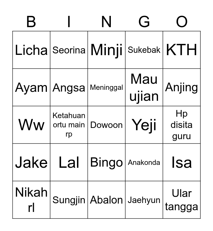 This bingo card has 25 words: Jake, Sungjin, Dowoon, Jaehyun, KTH, Licha, Seorina, Minji, Yeji, Isa, Ayam, Angsa, Abalon, Anakonda, Anjing, Nikah rl, Ketahuan ortu main rp, Meninggal, Mau ujian, Hp disita guru, Ww, Lal, Bingo, Sukebak and Ular tangga.