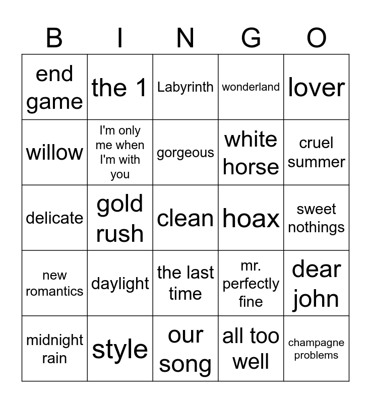 This bingo card has 25 words: daylight, our song, gorgeous, midnight rain, lover, end game, willow, the 1, hoax, the last time, white horse, delicate, mr. perfectly fine, dear john, I'm only me when I'm with you, champagne problems, sweet nothings, Labyrinth, cruel summer, gold rush, clean, style, new romantics, wonderland and all too well.