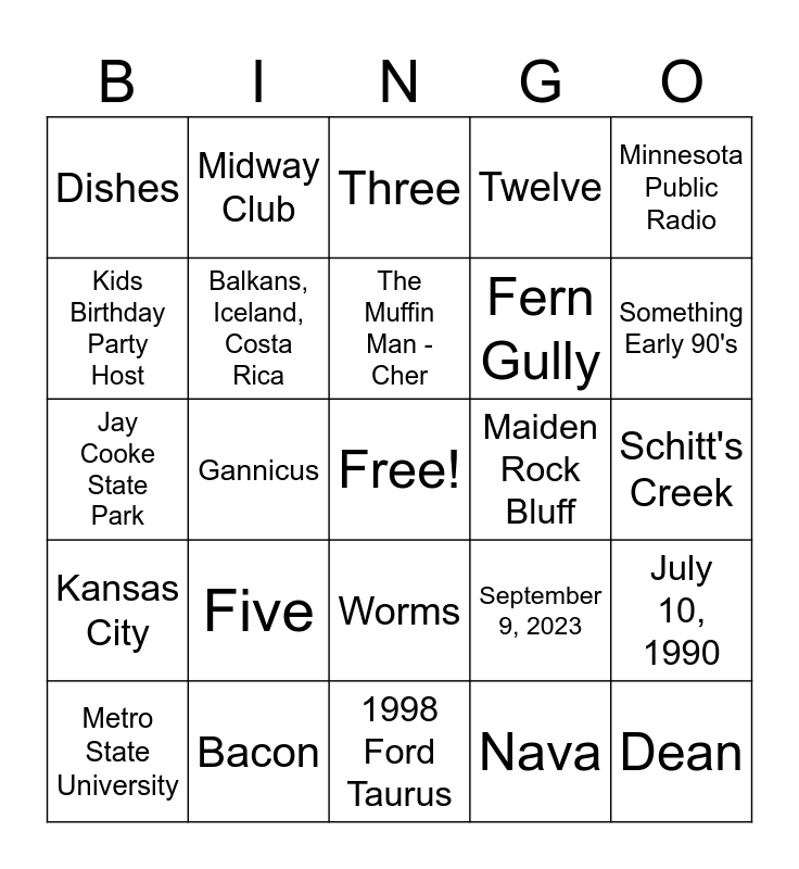 This bingo card has a free space and 27 words: September 9, 2023, Hazel, Fern Gully, 1998 Ford Taurus, Kids Birthday Party Host, Three, Midway Club, Kansas City, Maiden Rock Bluff, July 10, 1990, Jay Cooke State Park, Twelve, Metro State University, Bacon, Something Early 90's, Paul Bunyan, Balkans, Iceland, Costa Rica, The Muffin Man -Cher, Five, Dishes, Schitt's Creek, Nava, Gannicus, Dean, Worms, Minnesota Public Radio and Green.