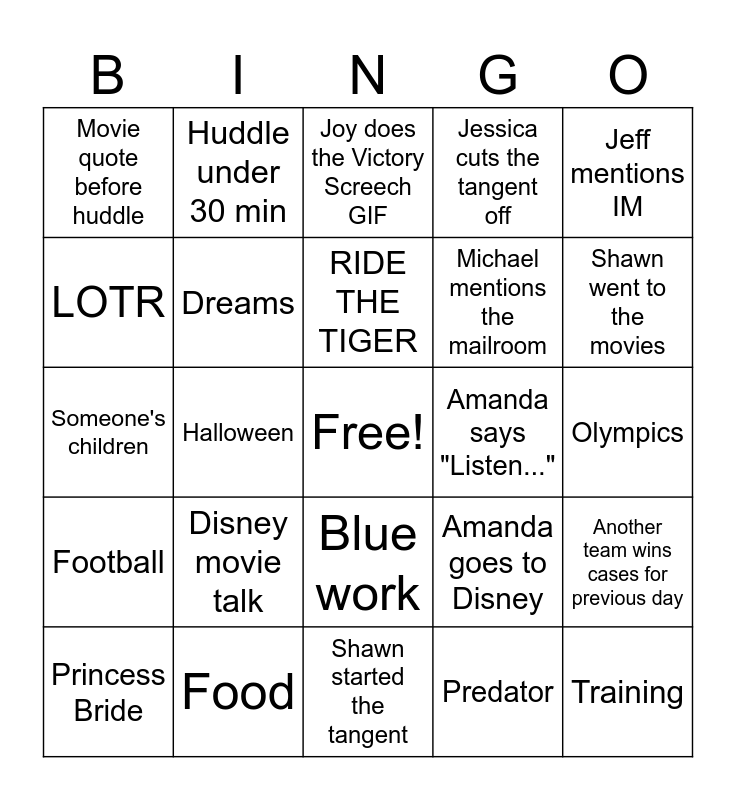 This bingo card has a free space and 69 words: Enlighten, Olympics, RTO/WFH, Buttah, Food, Twilight, Jessica cuts the tangent off, Han talks, Jeff mentions IM, Plants/Yard talk, Another team wins cases for previous day, Eagle, Movie quote before huddle, Joy does the Victory Screech GIF, Someone mentions sleep, Halloween, Blue work, Michael mentions the mailroom, Amanda does the Get Out GIF, Football, Amanda says "Listen...", Amanda goes to Disney, Shawn went to the movies, Monster case mentioned, RP, PTO, Harry Potter, Fantasy Football, Predator, Star Wars, Huddle under 30 min, Joy gets mad, Jeff makes a new Schword, Melissa asks a work related question, Sendwords, Video Games, SURVIVE, Sequels, LOTR, Banana, Disney movie talk, Training, ER, Ted Lasso, Coffee/Caffeine, Princess Bride, Booktalk, the old building, Brinkley makes an appearance, Dreams, RIDE THE TIGER, Duke don't dance with..., Michael started the tangent, Shawn started the tangent, Michael mentions someone by full name, Yellow Tape, Monty Python, Podcast, Fake trivia points, Someone's children, Skylar coming to Texas, The Grinch is mentioned, She's the Man reference, PulpFliction, Former Peterson team members mentioned, The Island, The Row, You're going to change the world and Shawn says he'll schedule 1-on-1's.
