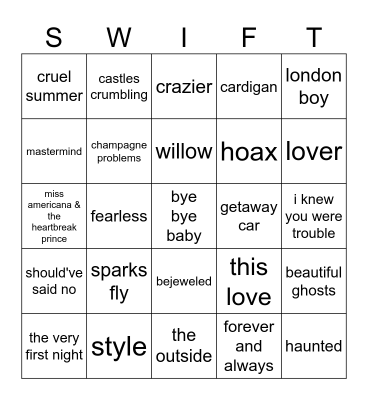 This bingo card has a free space and 24 words: sparks fly, style, willow, the very first night, london boy, cruel summer, mastermind, castles crumbling, getaway car, bejeweled, hoax, miss americana & the heartbreak prince, this love, beautiful ghosts, champagne problems, forever and always, i knew you were trouble, crazier, lover, fearless, haunted, should've said no, cardigan and the outside.