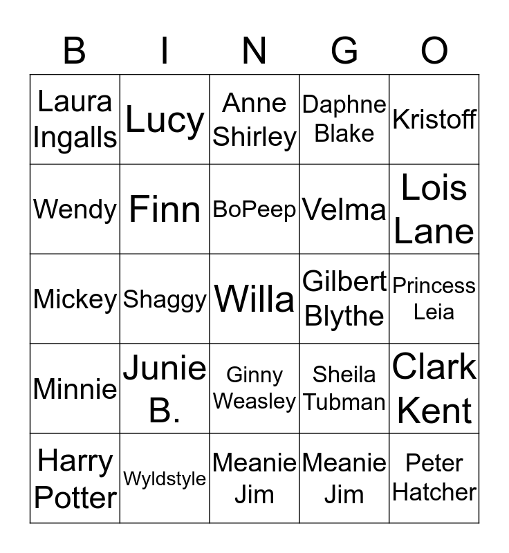 This bingo card has a free space and 31 words: Meanie Jim, Buzz, Shaggy, Peter Pan, Laura Ingalls, Anne Shirley, Finn, Sheila Tubman, Gilbert Blythe, Meanie Jim, Princess Leia, Peter Hatcher, Fred Jones, Schroeder, Lois Lane, Emmet, Clark Kent, Junie B., Minnie, Ginny Weasley, Kristoff, Han Solo, Harry Potter, Lucy, Velma, Wendy, Daphne Blake, Mickey, Wyldstyle, BoPeep and Almanzo Wilder.