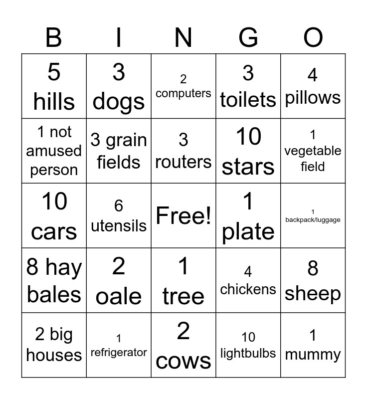 This bingo card has a free space and 24 words: 2 oale, 1 refrigerator, 3 routers, 2 big houses, 4 pillows, 5 hills, 1 not amused person, 3 dogs, 1 plate, 1 tree, 10 stars, 10 cars, 4 chickens, 8 sheep, 3 grain fields, 10 lightbulbs, 1 backpack/luggage, 2 computers, 1 vegetable field, 6 utensils, 1 mummy, 8 hay bales, 3 toilets and 2 cows.