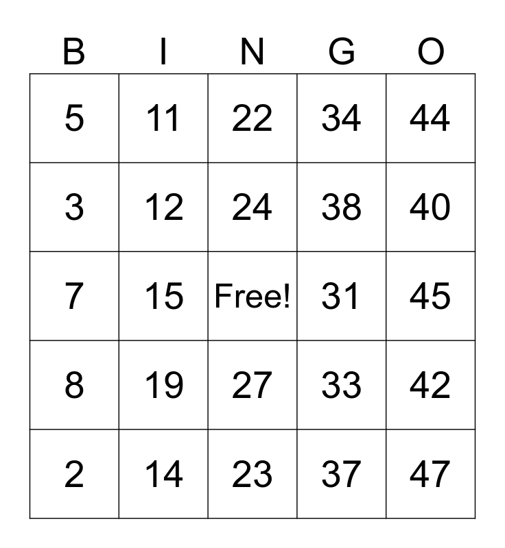 This bingo card has a free space and 48 words: 1, 10, 20, 30, 40, 2, 11, 21, 31, 41, 3, 12, 32, 42, 4, 13, 22, 33, 43, 5, 14, 23, 34, 44, 6, 15, 24, 35, 45, 7, 16, 25, 36, 46, 8, 17, 26, 37, 47, 9, 18, 27, 38, 48, 19, 28, 39 and 49.