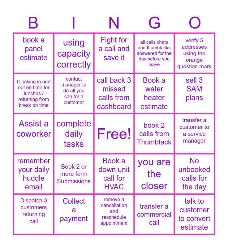 This bingo card has a free space and 29 words: Dispatch 3 customers returning call, motivate the team, complete daily tasks, book a call from the bookings screen, book a panel estimate, Fight for a call and save it, contact manager to do all you can for a customer, Book 2 or more form Submissions, book 2 calls from Thumbtack, Collect a payment, transfer a customer to a service manager, talk to customer to convert estimate, remove a cancellation and reschedule appointment, transfer a commercial call, sell 3 SAM plans, you are on call this week, Book a down unit call for HVAC, remember your daily huddle email, verify 5 addresses using the orange question mark, Assist a coworker, you are the closer, book a call from chats, Book a water heater estimate, Clocking in and out on time for lunches / returning from break on time, all calls chats and thumbtacks answered for the day before you leave, using capacity correctly, No unbooked calls for the day, call back 3 missed calls from dashboard and booking an emergency appointment.
