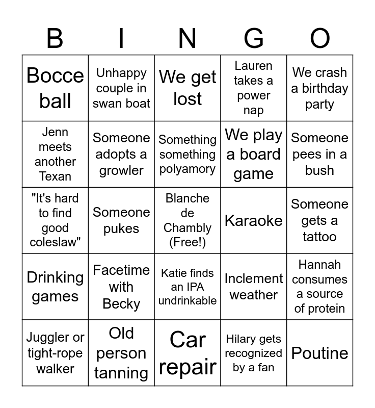 This bingo card has a free space and 24 words: Facetime with Becky, Old person tanning, Something something polyamory, Juggler or tight-rope walker, We crash a birthday party, Bocce ball, Jenn meets another Texan, Unhappy couple in swan boat, Karaoke, Katie finds an IPA undrinkable, We play a board game, "It's hard to find good coleslaw", Inclement weather, Hannah consumes a source of protein, Someone adopts a growler, Hilary gets recognized by a fan, Someone gets a tattoo, We get lost, Someone pees in a bush, Someone pukes, Poutine, Drinking games, Lauren takes a power nap and Car repair.