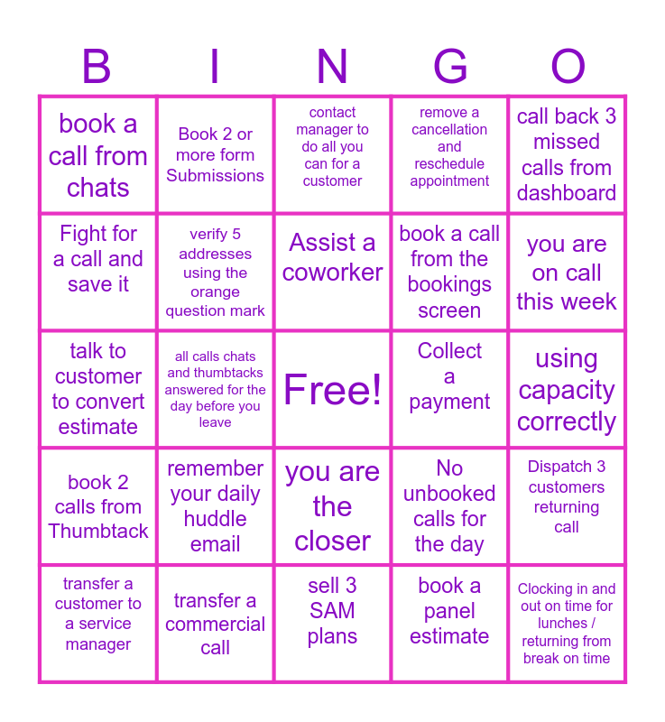 This bingo card has a free space and 28 words: Dispatch 3 customers returning call, motivate the team, book a call from the bookings screen, book a panel estimate, Fight for a call and save it, contact manager to do all you can for a customer, Book 2 or more form Submissions, book 2 calls from Thumbtack, Collect a payment, transfer a customer to a service manager, talk to customer to convert estimate, remove a cancellation and reschedule appointment, transfer a commercial call, sell 3 SAM plans, you are on call this week, Book a down unit call for HVAC, remember your daily huddle email, verify 5 addresses using the orange question mark, Assist a coworker, you are the closer, book a call from chats, Book a water heater estimate, Clocking in and out on time for lunches / returning from break on time, all calls chats and thumbtacks answered for the day before you leave, using capacity correctly, No unbooked calls for the day, call back 3 missed calls from dashboard and booking an emergency appointment.
