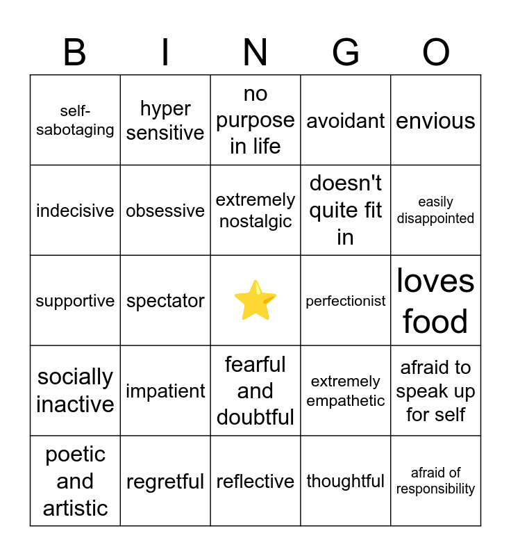 This bingo card has a free space and 24 words: impatient, regretful, extremely nostalgic, poetic and artistic, envious, self- sabotaging, indecisive, hyper sensitive, perfectionist, fearful and doubtful, doesn't quite fit in, supportive, extremely empathetic, afraid to speak up for self, obsessive, thoughtful, loves food, no purpose in life, easily disappointed, spectator, afraid of responsibility, socially inactive, avoidant and reflective.