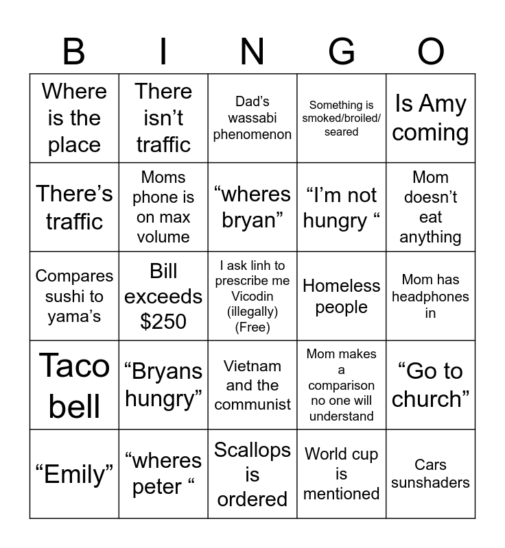 This bingo card has a free space and 24 words: “Bryans hungry”, “wheres peter “, “wheres bryan”, “Emily”, Is Amy coming, Where is the place, There’s traffic, There isn’t traffic, Homeless people, Vietnam and the communist, “I’m not hungry “, Compares sushi to yama’s, Mom makes a comparison no one will understand, “Go to church”, Moms phone is on max volume, World cup is mentioned, Mom has headphones in, Dad’s wassabi phenomenon, Mom doesn’t eat anything, Bill exceeds $250, Cars sunshaders, Taco bell, Something is smoked/broiled/ seared and Scallops is ordered.
