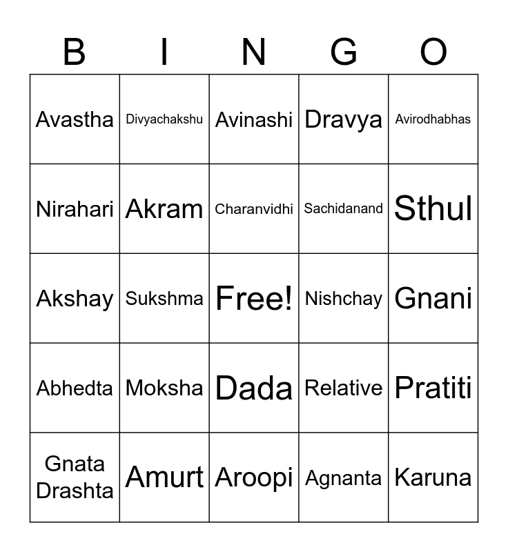 This bingo card has a free space and 91 words: Aatma, Shudhatma, Dada, Dadavani, Niruma, Krodh, Maan, Kapat, Lobh, Simandher swami, Agna, Nav kalamo, Gnan, Gnani, Trimantra, Charanvidhi, Vitarag, Keval gnan, Samayik, Pratikraman, Pratyakhyan, Alochana, Aroopi, Asang, Akshay, Amurt, Achyut, Ajanma, Amar, Tankotkirna, Darshan, Pratiti, Laghutam, Abhedta, Avastha, Dravya, Avinashi, Avyaya, Sukshma, Sthul, Gnata Drashta, Nirahari, Niralamb, Vyavasthit, File, Relative, Sahaj, Purusharth, Bhakti, Jagruti, Vignan, Sachidanand, Sambhav, Mahavideh, Tirthankar, Tatva, Nishchay, Dakho, Samkit, Aham, Syaadvaad, Pragna, Vani, Pratyaksh, Brahmacharya, Vishay, Samrasi, Agnanta, Bharat kshetra, Judapanu, Moksha, Karuna, Prem, Bhranti, Divyachakshu, Akram, Budhhi, Gnanvidhi, Chikni file, Dosh, Anand, Avirodhabhas, Kramik, Puran galan, Ahankar, Adjust, Aadai, Klesh, Adith-tap, Moh and Striprakruti.