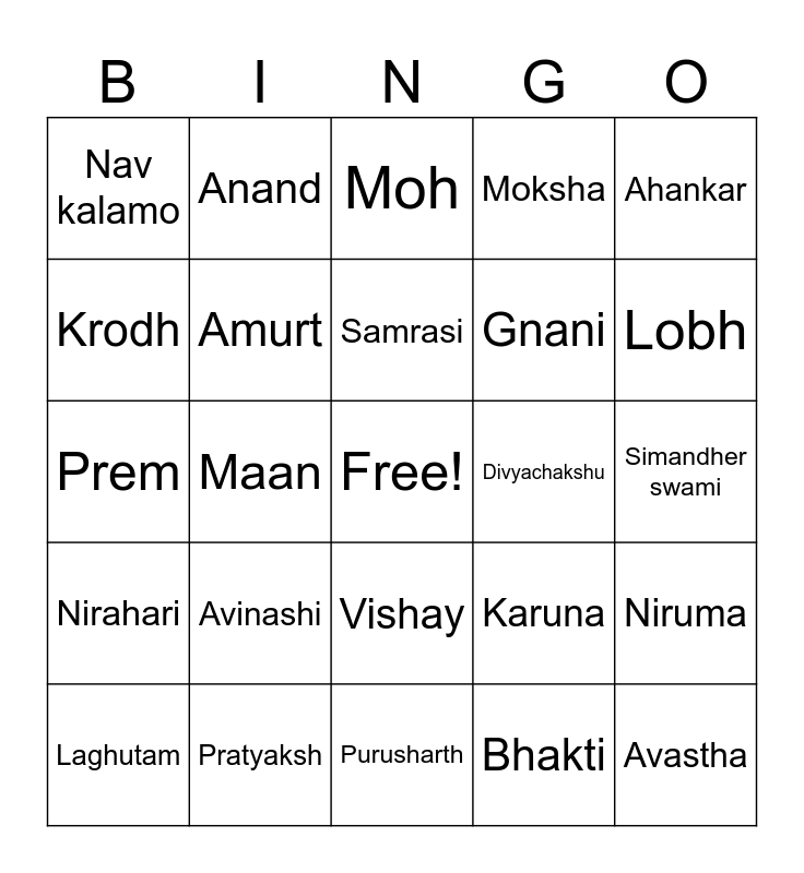 This bingo card has a free space and 91 words: Vyavasthit, Vitarag, Vishay, Vignan, Vani, Trimantra, Tirthankar, Tatva, Tankotkirna, Syaadvaad, Sukshma, Striprakruti, Sthul, Simandher swami, Shudhatma, Samrasi, Samkit, Sambhav, Samayik, Sahaj, Sachidanand, Relative, Purusharth, Puran galan, Prem, Pratyaksh, Pratyakhyan, Pratiti, Pratikraman, Pragna, Nishchay, Niruma, Niralamb, Nirahari, Nav kalamo, Moksha, Moh, Mahavideh, Maan, Lobh, Laghutam, Krodh, Kramik, Klesh, Keval gnan, Karuna, Kapat, Judapanu, Jagruti, Gnata Drashta, Gnanvidhi, Gnani, Gnan, File, Dravya, Dosh, Divyachakshu, Darshan, Dakho, Dadavani, Dada, Chikni file, Charanvidhi, Budhhi, Brahmacharya, Bhranti, Bharat kshetra, Bhakti, Avyaya, Avirodhabhas, Avinashi, Avastha, Asang, Aroopi, Anand, Amurt, Amar, Alochana, Akshay, Akram, Ajanma, Ahankar, Aham, Agnanta, Agna, Adjust, Adith-tap, Achyut, Abhedta, Aatma and Aadai.